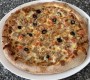 Crème fraîche, mozzarella, jambon, lardons, ptd, oignons, poivrons